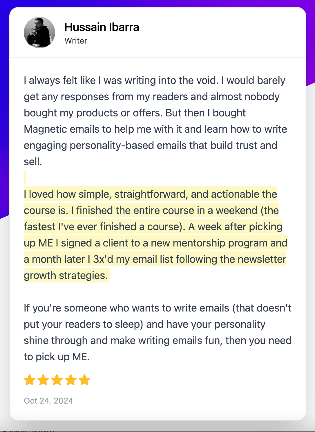Every lesson inside is 5-10 minutes with zero wasted words. You’ll see how to connect your ideas with your audience’s problems so they look forward to seeing you in their inbox.