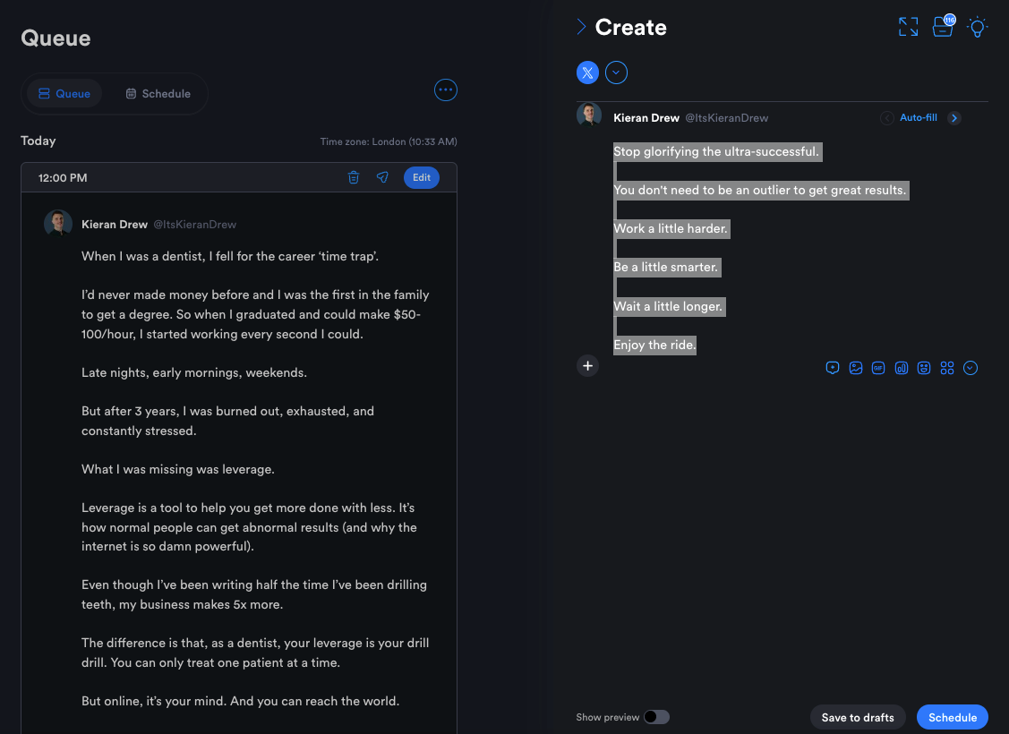 There are loads of features. But I mostly use the queue function, auto plug split testing (great for growing your newsletter), and the occasional auto-DM giveaway. I usually have 200+ posts scheduled, so I can often take weeks off social media content. This is useful for holidays, but also when I need a break/to focus on a business project.