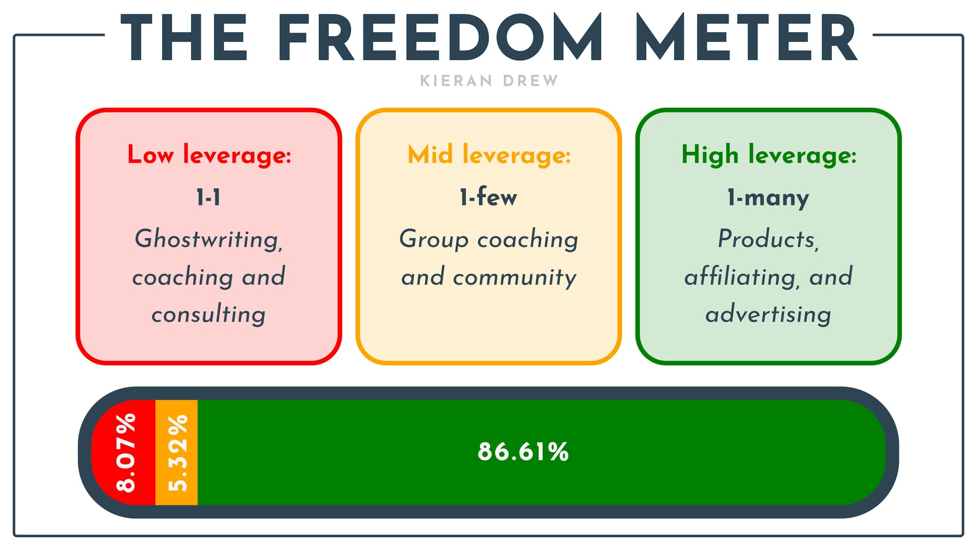 The freedom meter measures income sources based on their scalability. 14 months ago, 33% of my total earnings were ‘low leverage’.